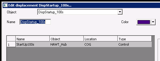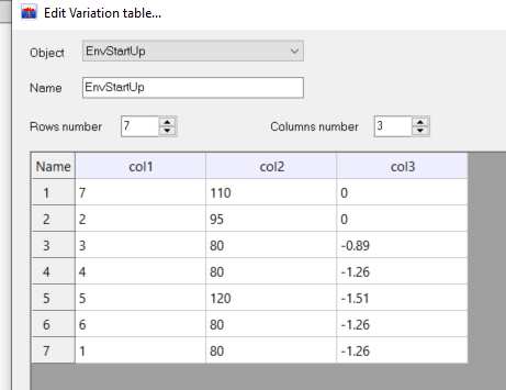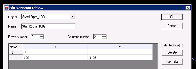 Start up has been defined in a displacement and start up variable in a variation table as shown below. The start up variable could also have been set to “default” which would have automatically selected “Start12rpm_100s”.