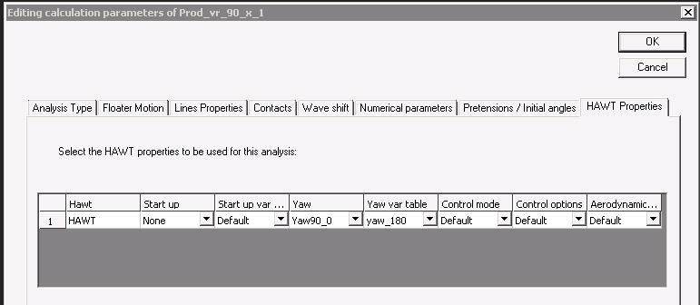 This simulation is the same than DLC_parked_parked, PROD_VR_90 or PROD_VR_90_X but the setup is done in a different way, using a new feature. This new feature is particularly useful during the building and testing of the model. In calculation parameters, the new sheet “HAWT properties” has been used and filled as follow: