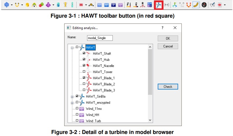 An HAWT is added to the model by clicking on the HAWT toolbar button (see Figure 3-1). This automatically created a shaft, a hub, a nacelle, a tower, and by default 3 blades (see Figure 3-2). The number of blades can be modified afterwards.