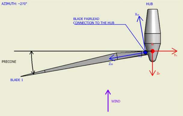 In the hub local frame, the blades initial pitch orientation is entered by the user. In most cases, it is defined in “production mode” where the pitch is close to 0° as opposed to the “feathered mode” where the pitch is close to -90°. In the following schematic, the blades are presented in production mode (No Tilt of the shaft).