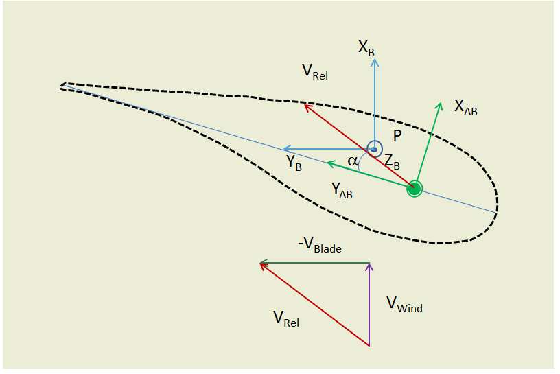 The combination of the wind speed and the local blade speed due to the turbine rotation generates an incident flow with an attack angle α with respect to the blade reference frame.