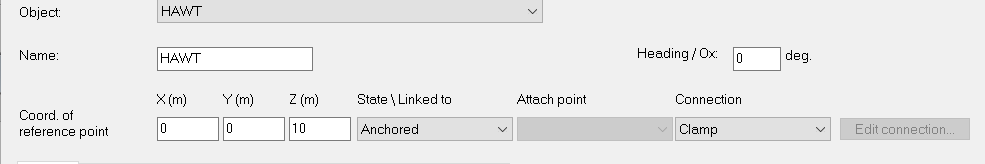 • The connection of the HAWT to other objects. In this example it is anchored and clamped which means that the bottom of the turbine does not move.
