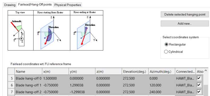 The shape and mechanical twist of the blades gives the equilibrium reference of the object (“User-defined shape”). The blade can be provided in an encrypted file or fully described. The shape of a fully described blade (which is the case here) is shown in the graphic interface and a visual check of the shape can be done (chord variations with length). The blade profiles are discussed in section 3.5. The 3 blades are similar and modifying values in the blade editor will modify the 3 blades.