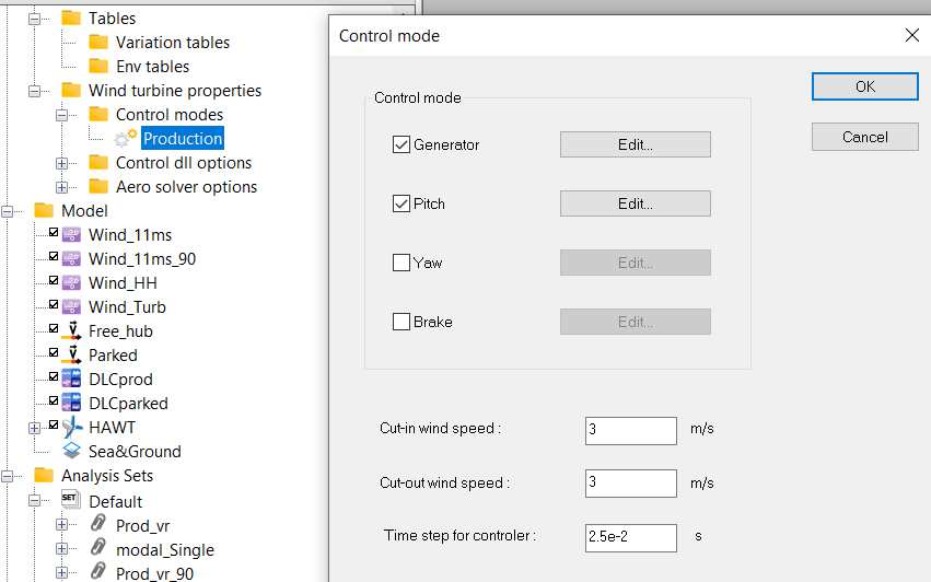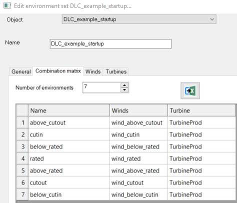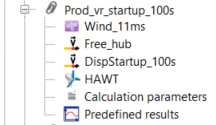 This is an analysis set with different production cases with wind speed varying from 2 to 30 m/s depending on the case. Wind speed is constant over time and height. Startup is applied to all cases with different parameters.