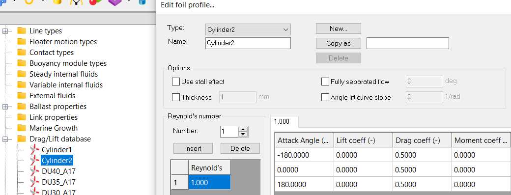 A line type is automatically created with tower properties. The tower is a line divided in several segments. The number of segments is defined in “Partition”. A global drag coefficient can be defined on the tower and can depend on the Reynolds number. When defined, this drag coefficient supersedes the drag coefficients potentially defined in the segment types of the beam elements composing the tower.