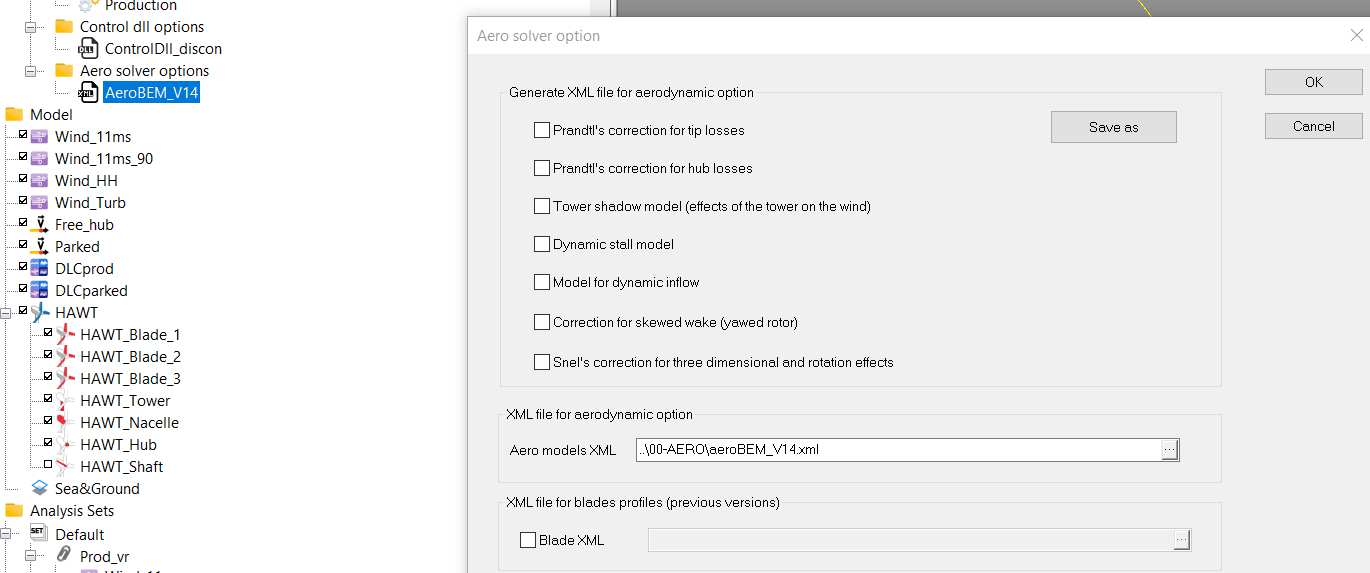 A Blade Element Momentum (BEM) model is used to model the aerodynamics.Aerodynamic coefficients are used to calculate transverse and longitudinal forces on blades. Secondary effects such as Tip loss, Hub loss, Tower Shadow, Dynamic Stall, Skewed Effect, Dynamic inflow or 3D Effect can also be modelled but are not detailed in this document. Documentation on these cases can be found in Aerodeep 2.2 User Manual.