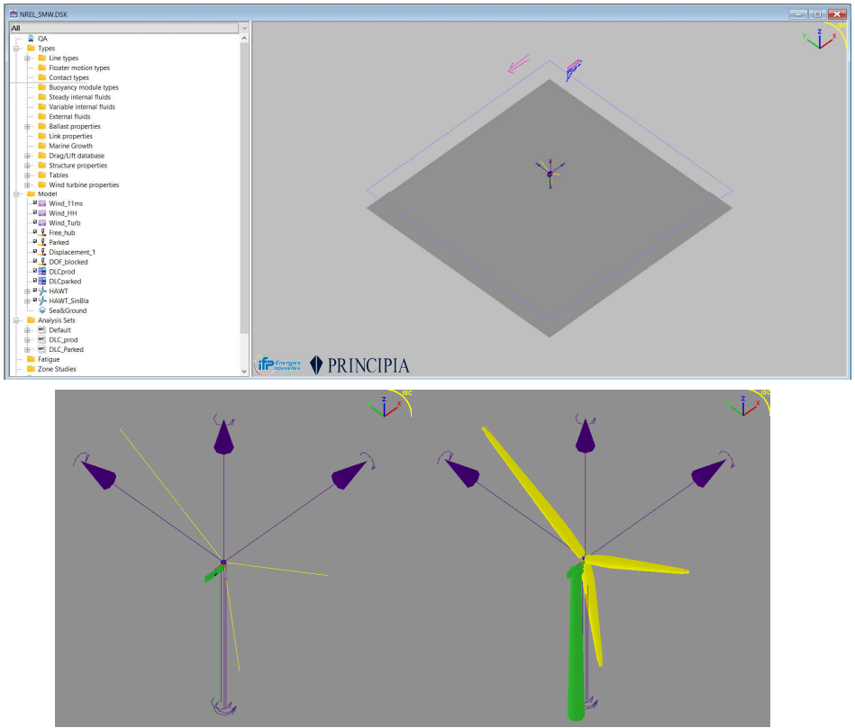 The example presented here is the NREL offshore 5MW baseline wind turbine with tower properties used for the OC4-DeepCwind semisubmersible. The model is shown below. This wind turbine is a conventional three-bladed upwind variable-speed variable blade-pitch-to-feather-controlled turbine.