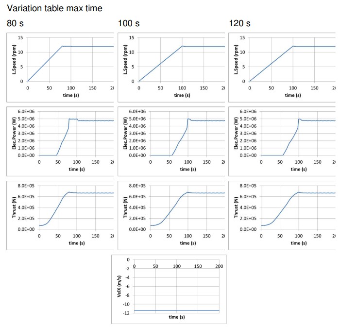 A rotor speed of approx. 12 rpm should be achieved at 100 s in all cases, and even before (at 80s) for the 80s case. The startup control is turn off at 100s. Results are similar for the 100 and 120 s case.