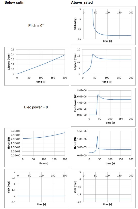 This is an analysis set with different production cases with wind speed varying from 2 to 30 m/s depending on the case. Wind speed is constant over time and height. A case (fixed) is also present in this analysis set for a case without control. However, the blades are not rotated by 90° to reduce thrust forces and therefore this is not a real parked case. See 6.13 for a parked case. Some results are shown below.