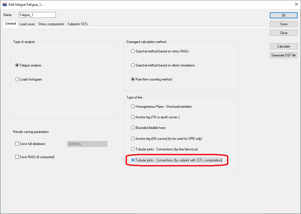 These SCF are used by fatigue study on tubular joints. Once the fatigue analysis has been created (see Fatigue analyses), the type of line Tubular joints - Connections (by subjoint with SCFs computation) must be selected as shown below.