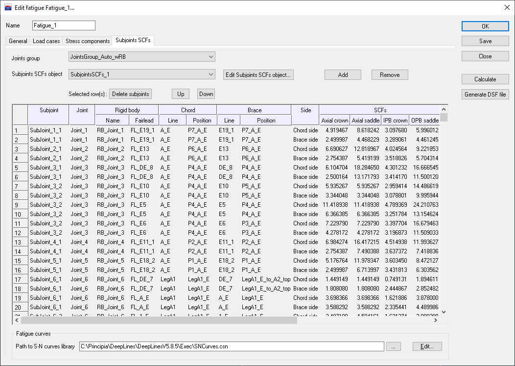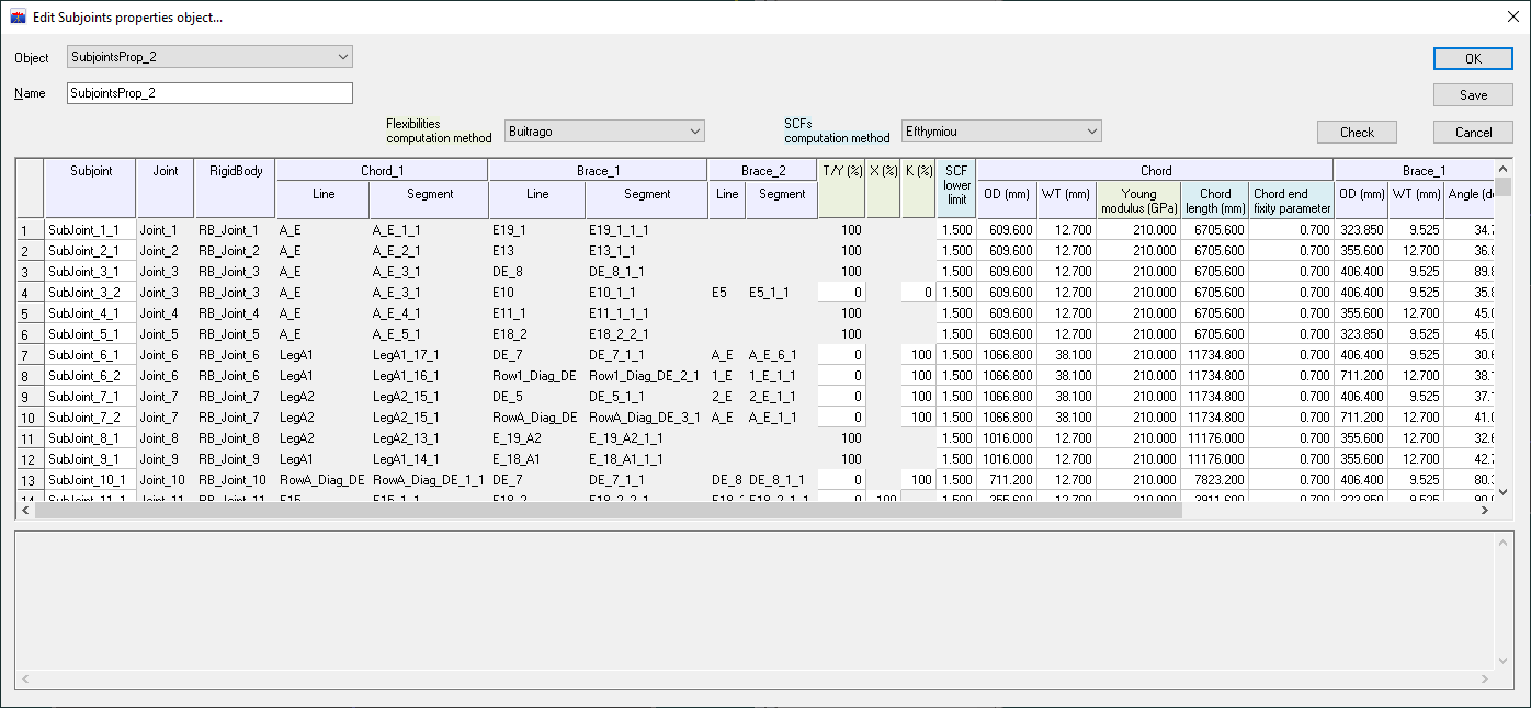 The stiffnesses or SCF are automatically calculated for each subjoint based on the properties assigned to the tubes in the properties object and their values are displayed in the last columns.