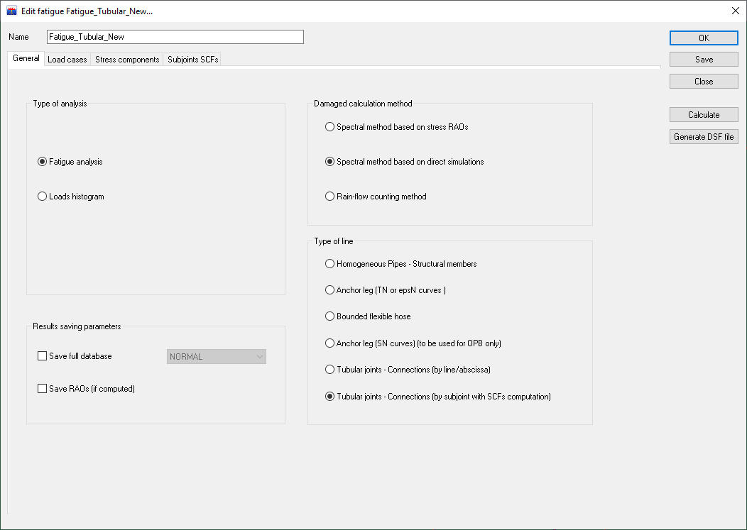 To define a fatigue analysis on subjoints, select the appropriate Type of line in the General tab of the Edit fatigue dialog box: