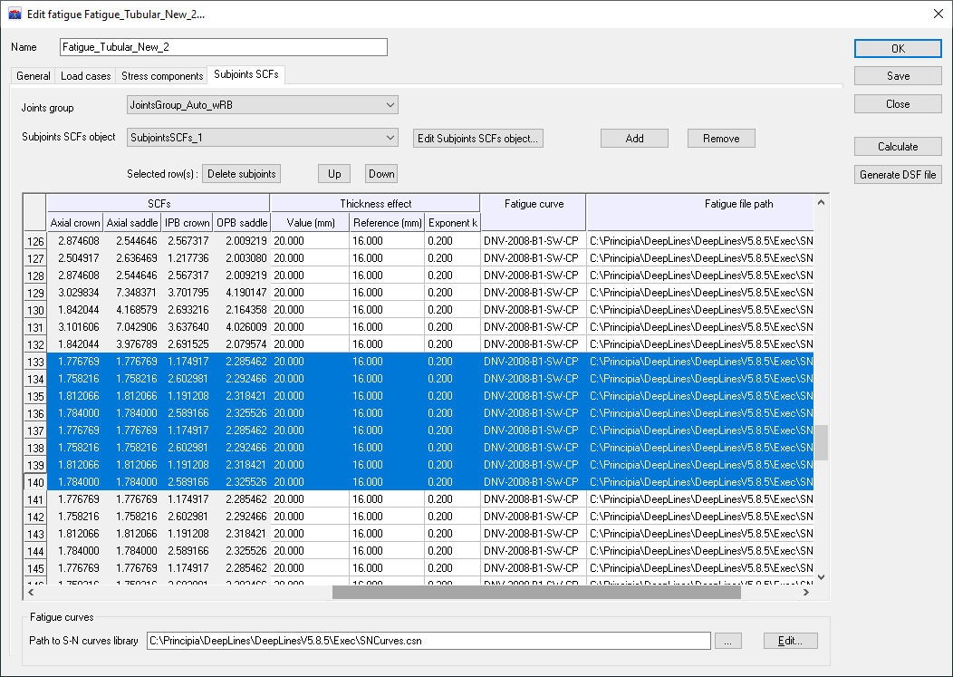 For fatigue calculations, it is necessary to create a Subjoints SCFs object using a method similar to that of a Subjoints stiffnesses object: simply drag the Subjoints properties object into the Subjoints SCFs group folder and a dialog box opens with the SCF computed with the Efthymiou method: