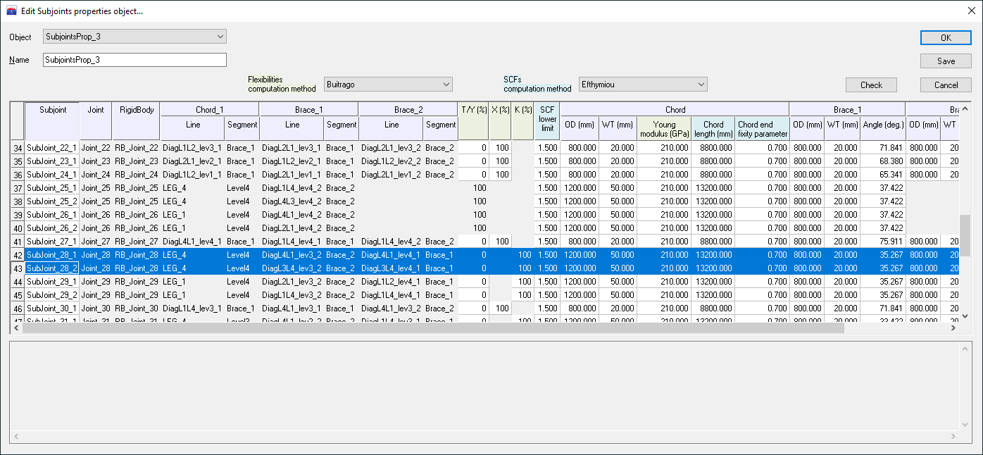 The table of subjoints definition and properties is filled with the default properties of the tubes (including geometric properties such as diameter, thickness, and the angle between the brace and the chord line) and can be changed by the user (for cells in background color white). Properties only used for the stiffnesses computation (with the Buitrago method) have their column titles in green and those used only for SCF calculations (with the Efthymiou method) have their column titles in blue.