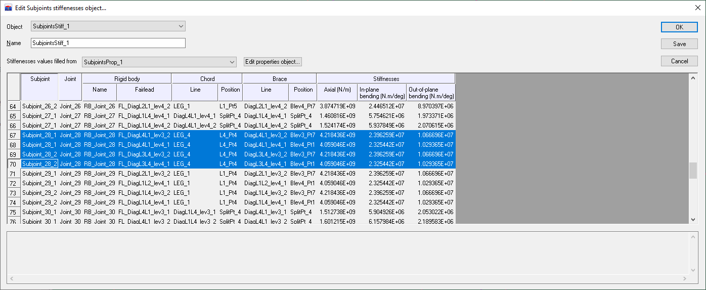 The Edit Subjoints stiffnesses object dialog box opens with the computed stiffnesses for each brace of subjoint: