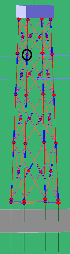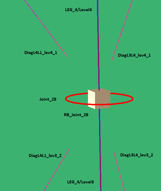 This joint has a chord line composed of 2 tubes (LEG_4/Level3, LEG_4/Level4) and 4 braces (DiagL4L1_lev4_1/Brace_1, DiagL4L1_lev3_2/Brace_2, DiagL3L4_lev3_2/Brace_2, DiagL3L4_lev4_1/Brace_1). Note that a tube is identified by the mention of the line and a segment.