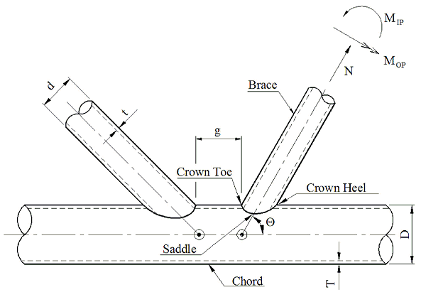 Here \(\mathsf{σ_x}\), \(\mathsf{σ_{my}}\) and \(\mathsf{σ_{mz}}\) are the maximum nominal stresses due to axial load and bending in-plane and out-of-plane respectively. \(\mathsf{SCF_{AS}}\) is the stress concentration factor at the saddle for axial load and the \(\mathsf{SCF_{AC}}\) is the stress concentration factor at the crown. \(\mathsf{SCF_{MIP}}\) is the stress concentration factor for in plane moment and \(\mathsf{SCF_{MOP}}\) is the stress concentration factor for out of plane moment.