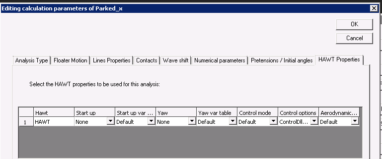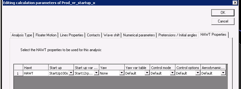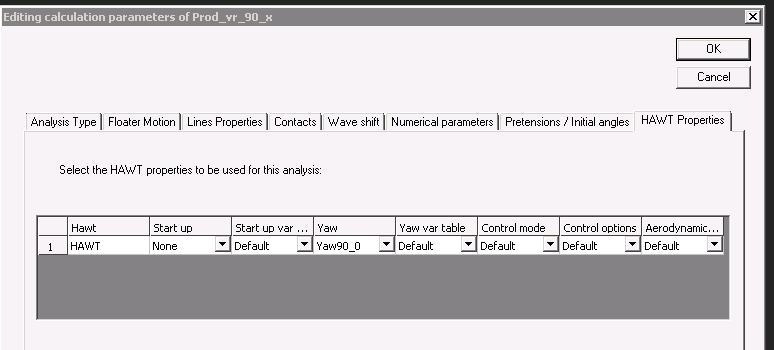 This simulation is the same than DLC_parked_parked, PROD_VR_90 or PROD_VR_90_X but the setup is done in a different way, using a new feature. This new feature is particularly useful during the building and testing of the model. In calculation parameters, the new sheet “HAWT properties” has been used and filled as follow: