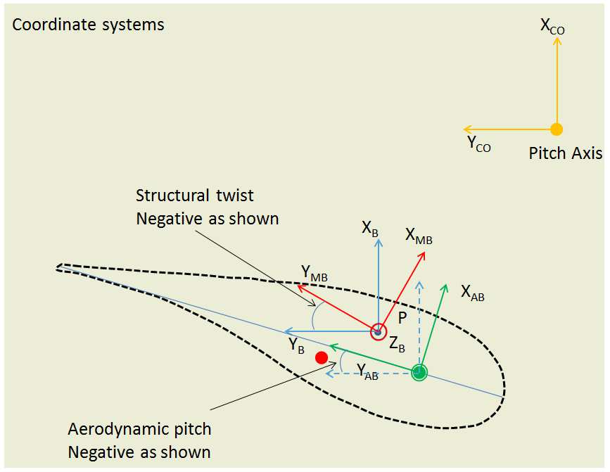 The aerodynamic center is defined in the profile properties. The orientation of the Aerodynamic Blade frame may be different from the Mechanical Blade Frame. Therefore the aerodynamic pitch is defined for each section in the Blade coordinate system. If the aerodynamic pitch is equal to the structural twist, the Mechanical Blade and Aerodynamic Blade frames are the same.