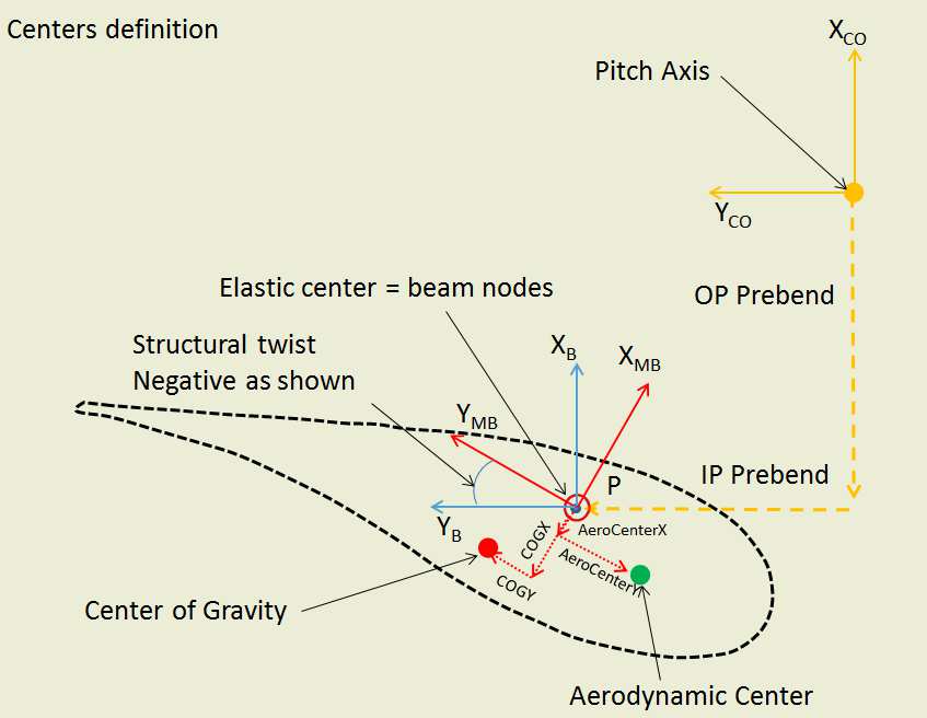 • The aerodynamic center position (x and y coordinate) and the CoG position (x and y coordinate) are defined in the Mechanical Blade (MB) frame (red frame below)