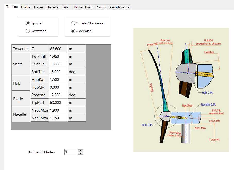 This panel allows defining that the turbine is upwind, rotating clockwise and has 3 blades. The tower altitude is automatically updated with the tower length (see Tower sheet 3.1.4) and coordinates of reference point (see 3.1.1) and indicate that the top of the tower of 87.6m above the MSL. Several dimensions are defined as illustrated by the drawing provided in the sheet.