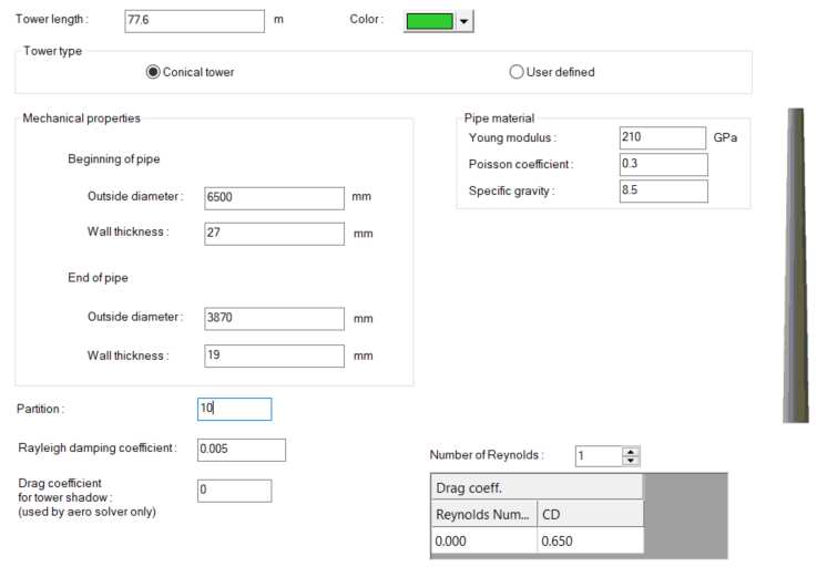 Tower properties are the ones for the OC4-DeepCwind semisubmersible [2]. The tower length was set to 77.6 m. The tower type is conical. Therefore, the base diameter (6.5 m) and thickness (0.027 m), top diameter (3.87 m) and thickness (0.019 m) are input. The shape of the tower can be visually checked in the GUI.