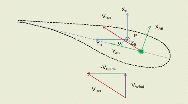 The combination of the wind speed and the local blade speed due to the turbine rotation generates an incident flow with an attack angle α with respect to the blade reference frame.