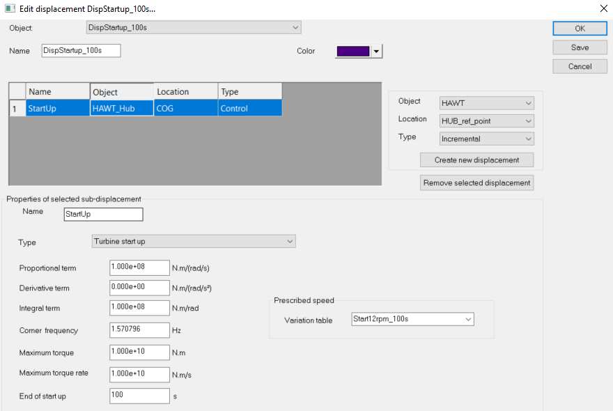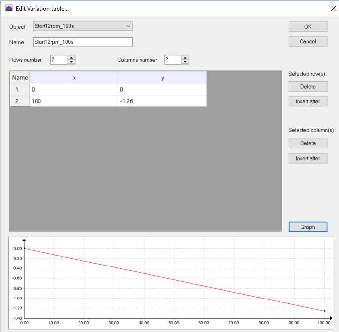 Start up has been defined in a displacement and start up variable in a variation table as shown below. The start up variable could also have been set to “default” which would have automatically selected “Start12rpm_100s”.