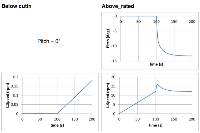 This simulation is run with a constant wind speed of 11 m/s slightly below the rated wind speed (11.4 m/s). Startup is applied in the variation tables during the first 80, 100 or 120 s of the simulation.