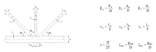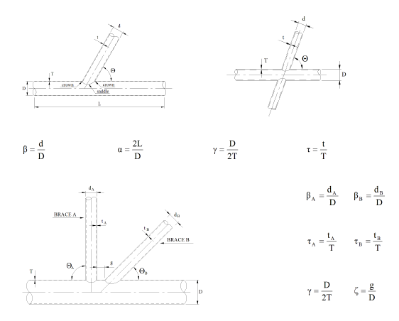 Their computations depend on the tube properties (diameter and thickness), percentage of subjoint type (Y, X, K, KT) and gap(s) between braces for K-joint or KT-joint.