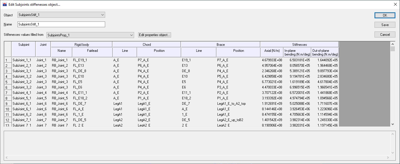 The stiffnesses or SCF are automatically calculated for each subjoint based on the properties assigned to the tubes in the properties object and their values are displayed in the last columns.