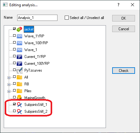 Stiffnesses are used by analyses launched by the solver. Once the Subjoints stiffnesses object has been created as explained in the previous section, it must be included in the analysis. This can be done by dragging the object into the analysis or selecting it from the list of objects assigned to the analysis: