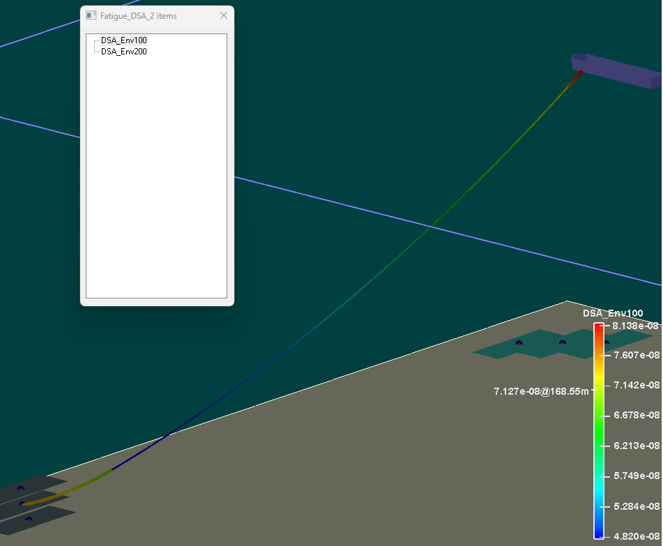The line segments colors are modified according to the fatigue values computed in the fatigue study. 3D display is forced. The fatigue value of a specific section (and its abscissa) can be displayed by hovering over it with the mouse: the value@abscissa is shown on the left of the color scale.