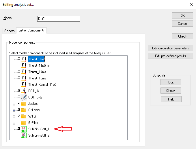 To take into account the subjoints stiffnesses in an analysis performed by the solver, select the Subjoints stifnesses object in the list of the analysis components: