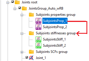 To define stiffnesses on subjoints, simply drag the Subjoints properties object into the Subjoints stiffnesses group folder: