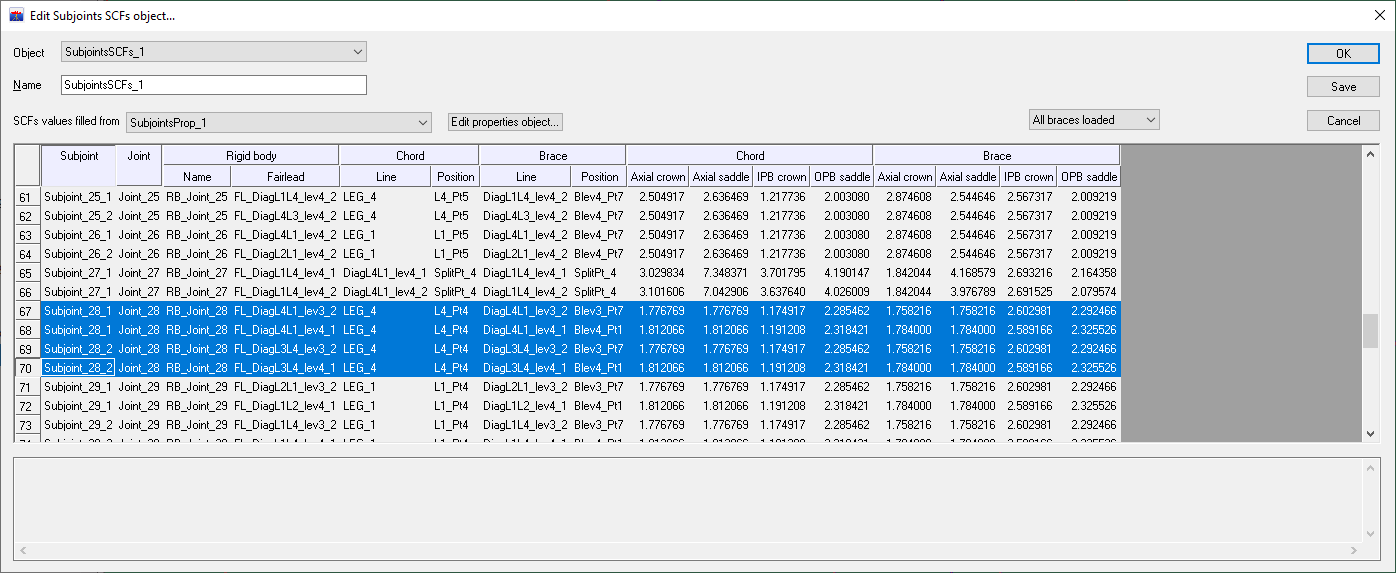 The table displays subjoints and their SCF contained in the Subjoints SCFs object. Note that the SCF for each brace are distributed on two lines: one for the chord side, the other for the brace side. The last columns allows the user to choose the fatigue curve.
