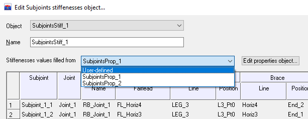 The Edit Subjoints stiffnesses object dialog box opens with the computed stiffnesses for each brace of subjoint: